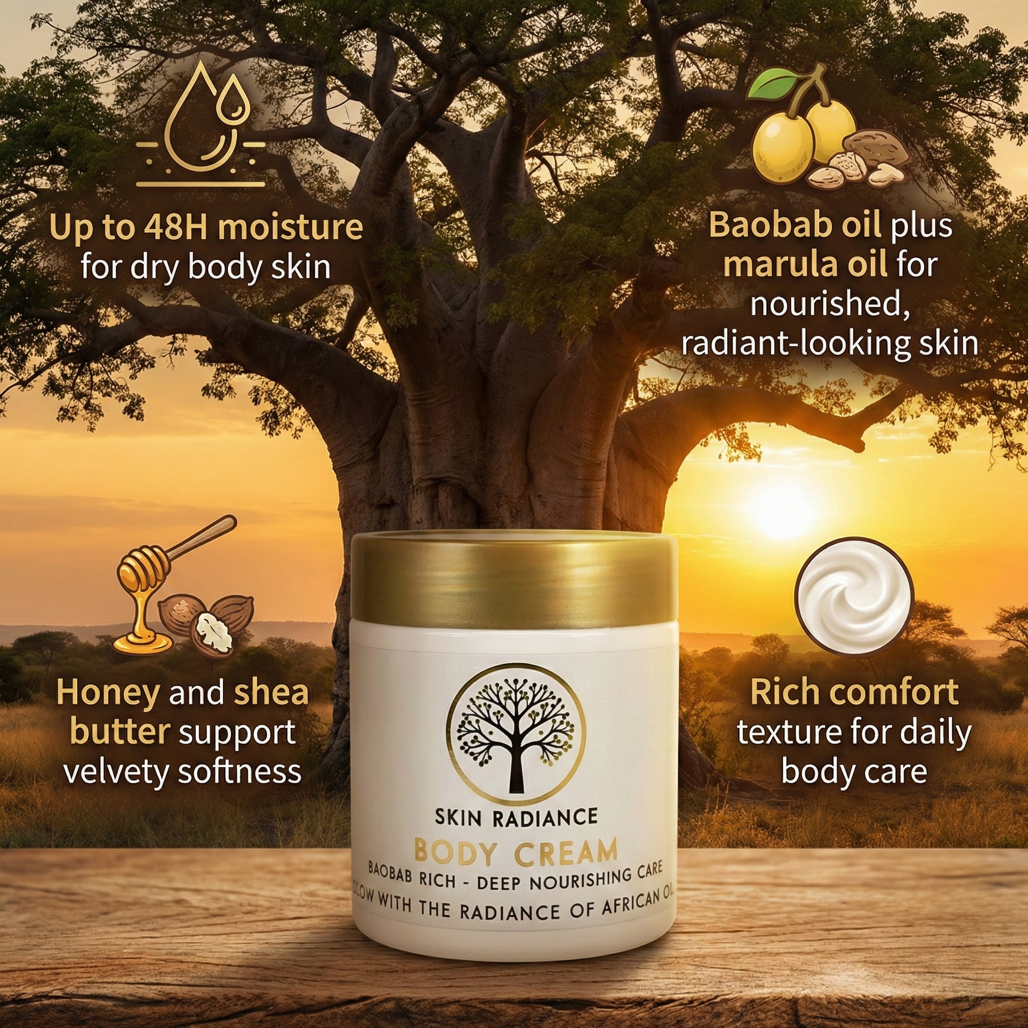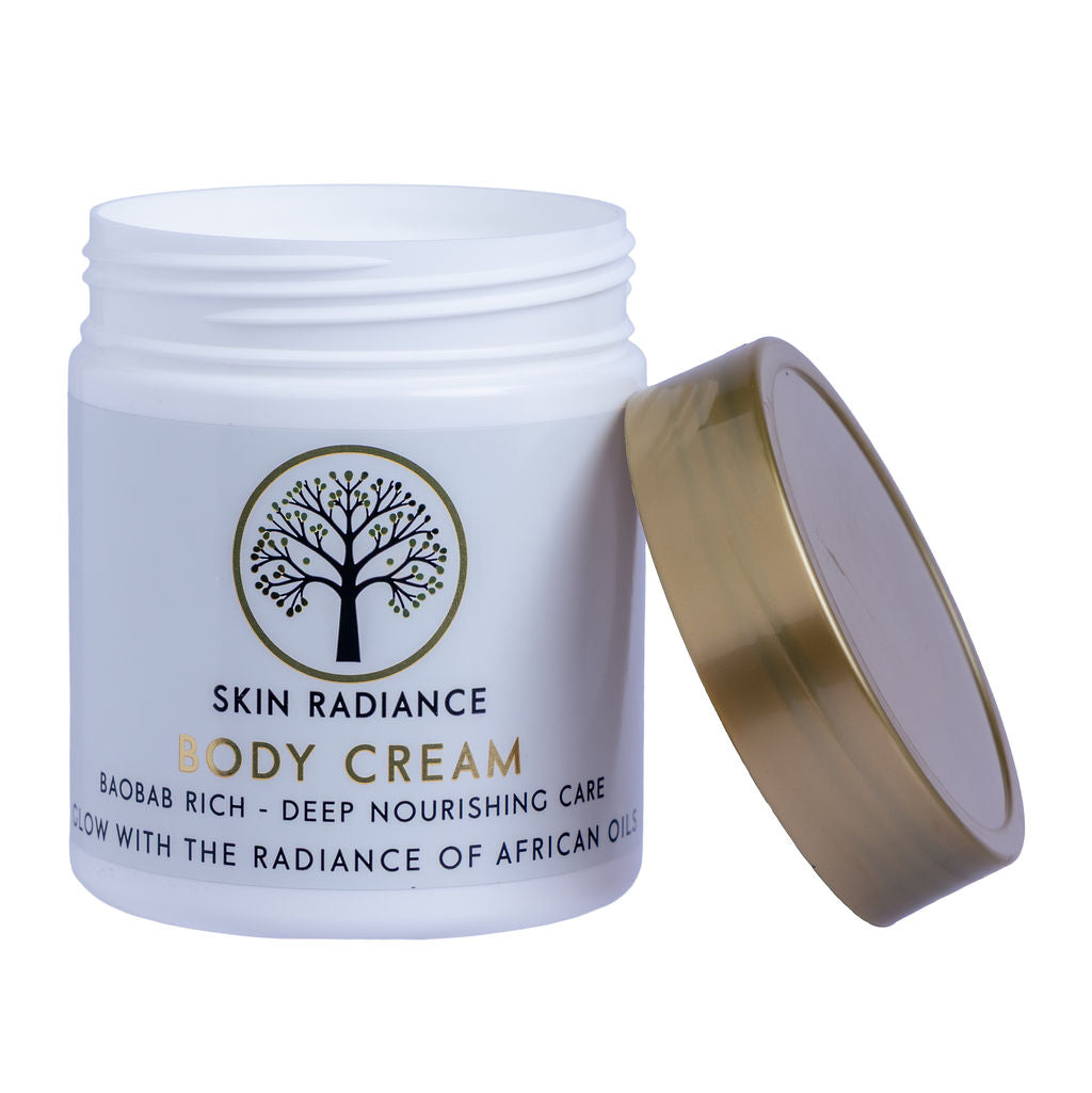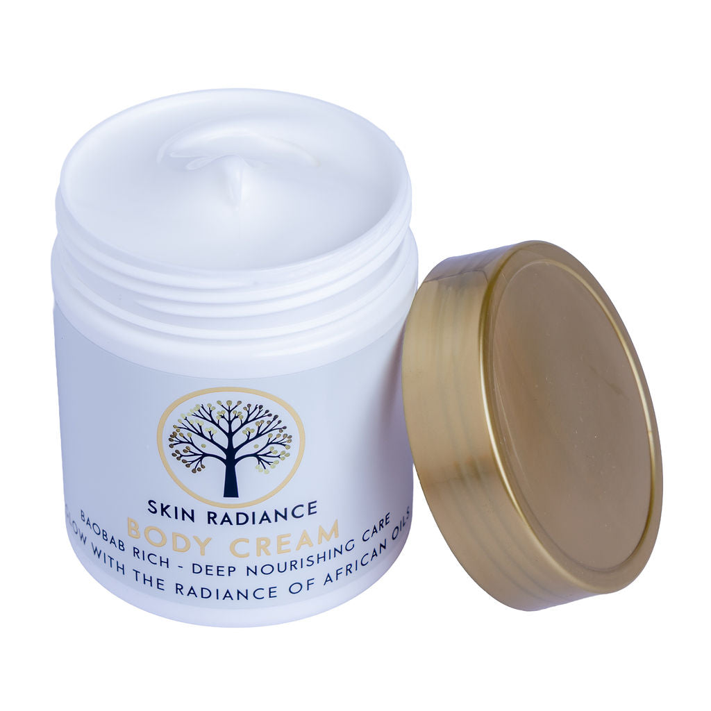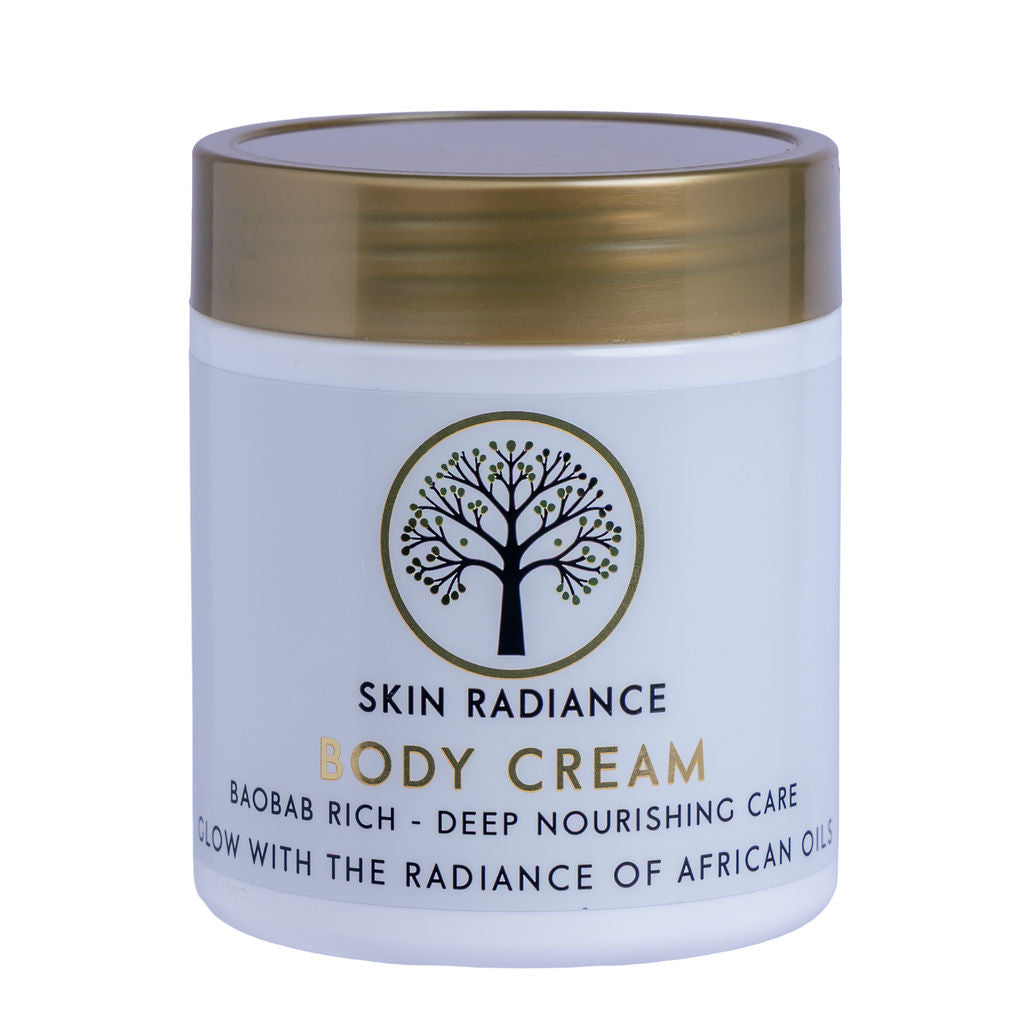 Skin Radiance Body Cream targets dry body skin with rich moisture and comfort. Baobab and Marula oils lead the African-oils signature. Honey and shea butter support softness for smooth, supple-looking skin.