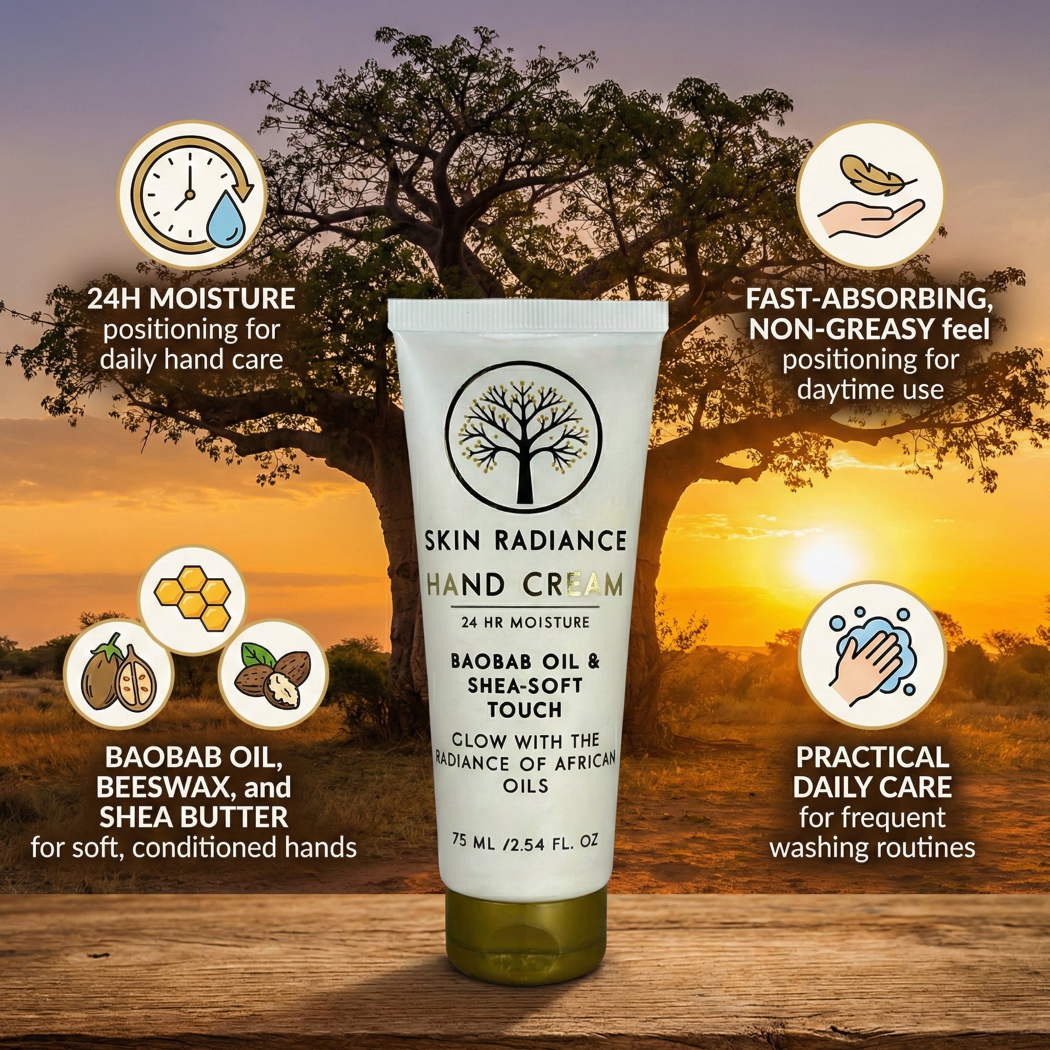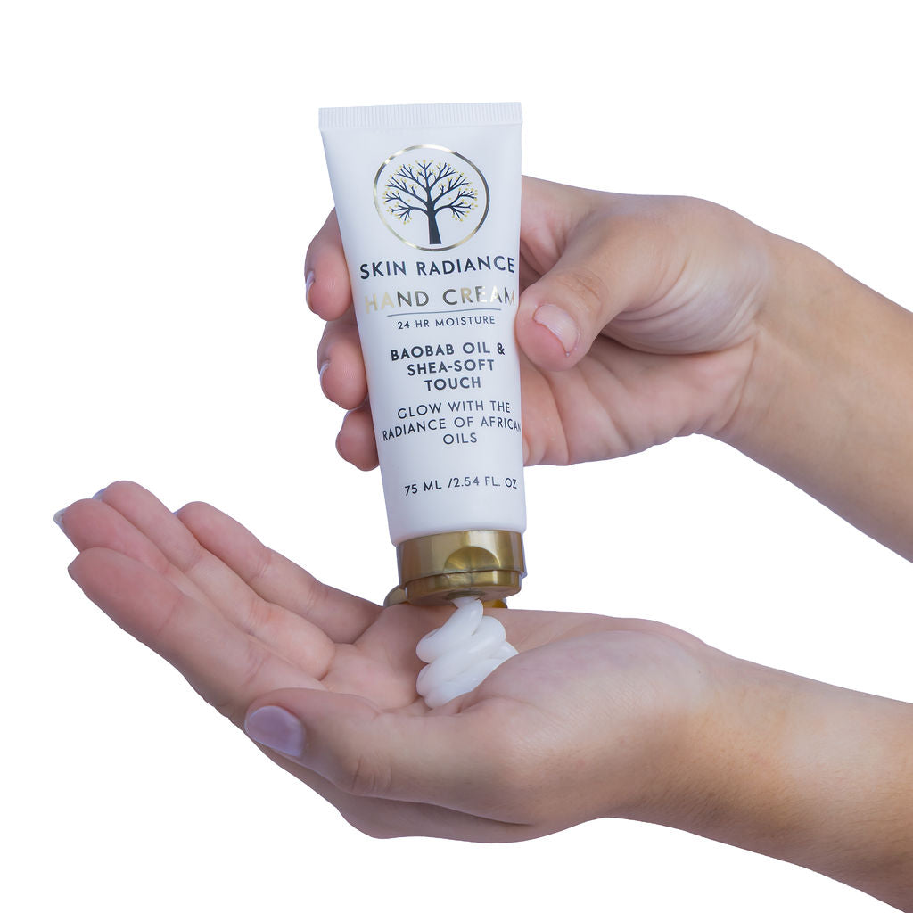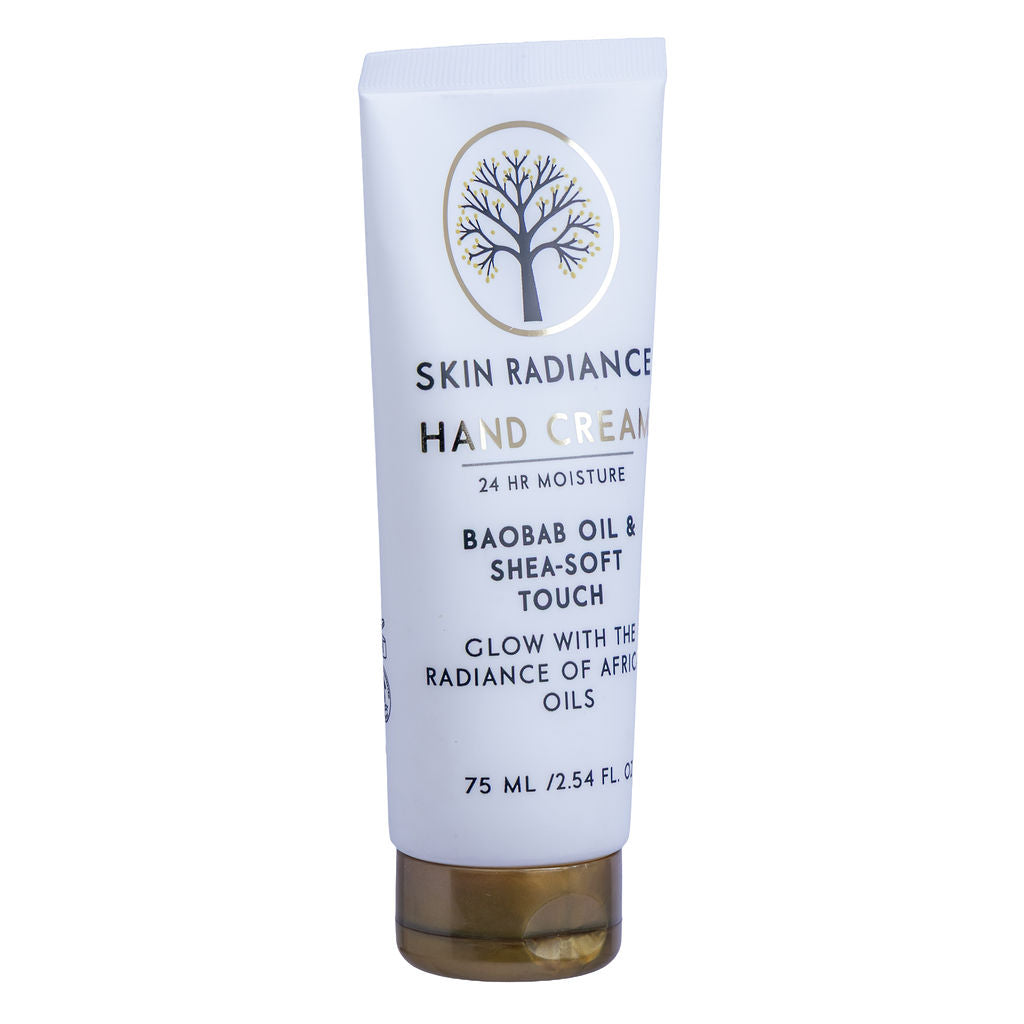 Skin Radiance Hand Cream delivers daily moisture with a quick-absorbing finish. Baobab oil leads with African botanical oils. Shea butter and beeswax support softness for hands exposed to frequent washing.